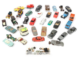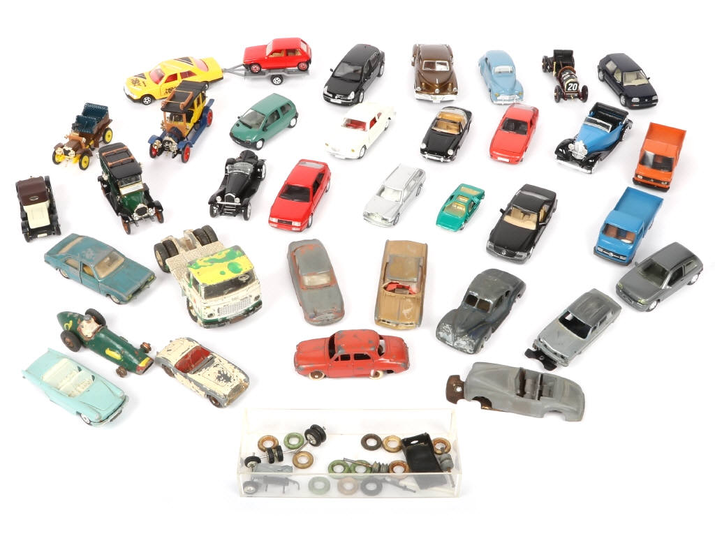 on y retrouve notamment les marques : DINKY TOYS, CURSOR MODELL, SOLIDO, SCHUCO & ELIGOR - comprend notamment les modèles : VOLKSWAGEN, PORSCHE, RENAULT, MERCEDES & PANHARD - manques & parties cassées - on y joint un lot d'accessoires