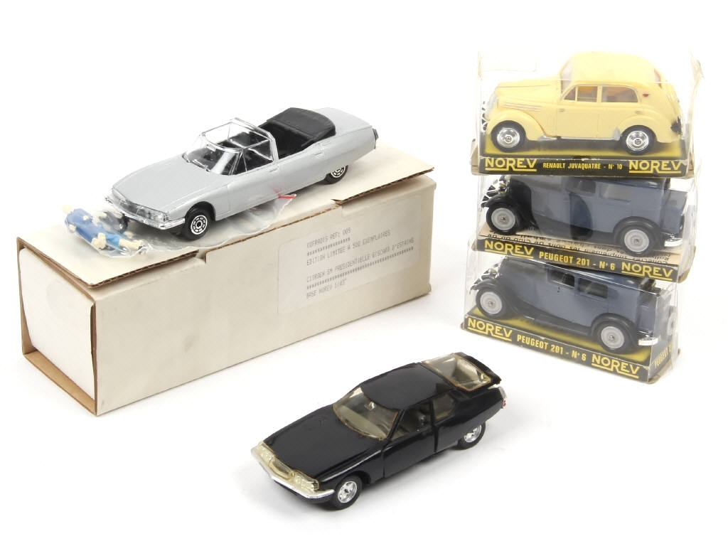 comprend : PEUGEOT 201 (2 exemplaires), RENAULT JUVAQUATRE (détails de peinture ajoutés) & CITROËN SM (2 exemplaires différents dont un sans boîte avec vitre de hayon à refixer & l'autre en série limitée à 500 exemplaires) - carrosseries plus ou moins déformées - les boîtes sont en état 'B'