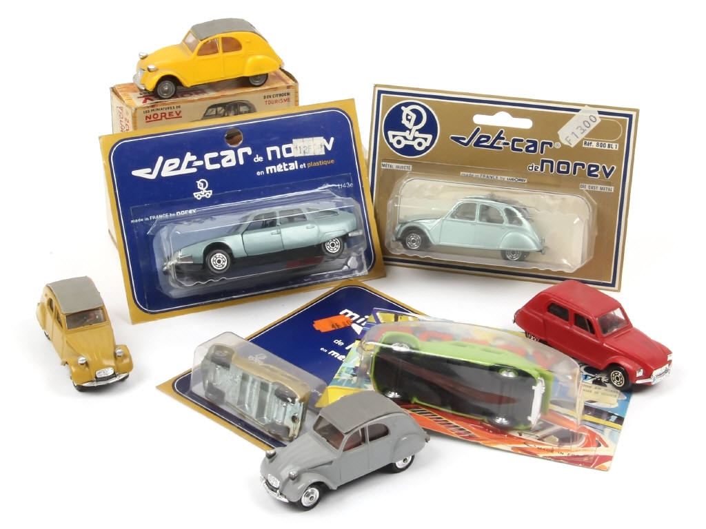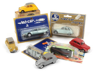 comprend les modèles : 2CV, CX & DYANE - 3 exemplaires sans boîte - quelques carrosseries très légèrement déformées & encrassées - une boîte en état 'c' & une autre avec blister froissé - 2 exemplaires de la série 'JET-CAR' & un autre 'MINI-JET'