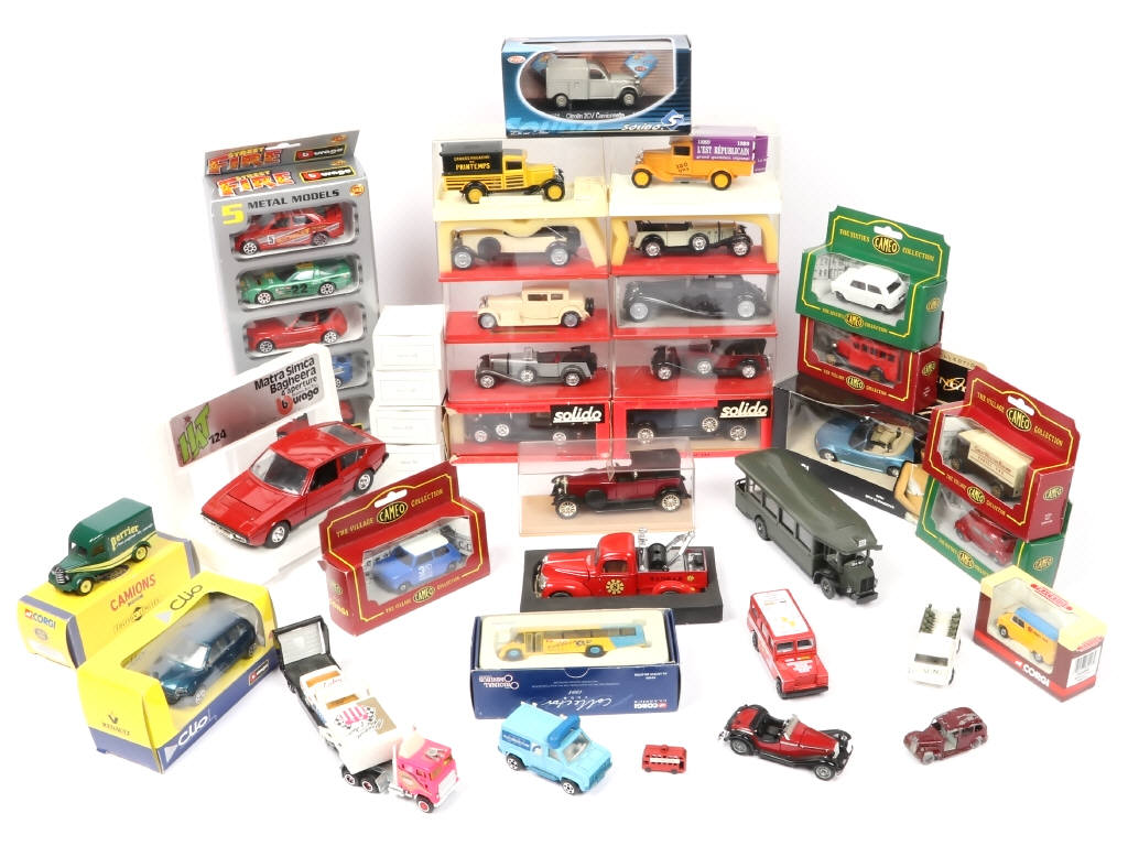 différentes échelles - on y retrouve notamment les marques : SOLIDO, CORGI, CAMEO, NOREV & MAJORETTE - comprend notamment les modèles : CITROËN, CHEVROLET, MINI, RENAULT & ALFA ROMEO - 10 modèles sans boîte - boîtes en états de 'b' à 'c' - possibilité de manques & parties cassées
