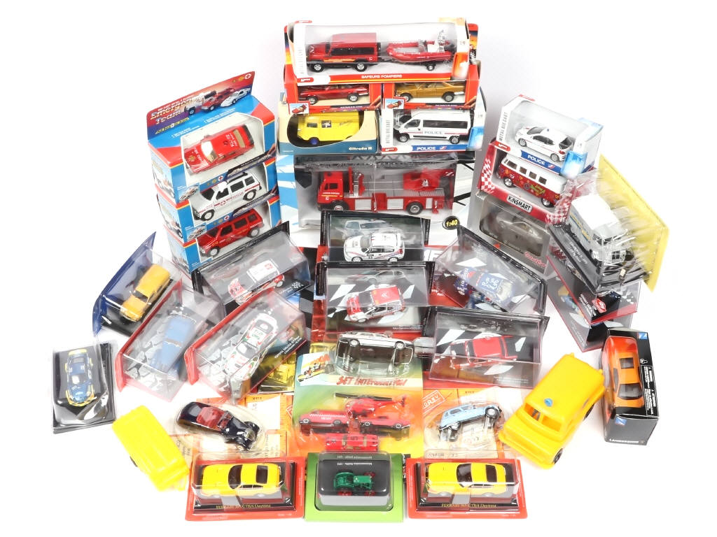 on y retrouve notamment les marques : NEWRAY, MONDOMOTORS, KINSMART & DETAILCARS - comprend notamment les modèles : FERRARI, CITROËN, SEAT & PEUGEOT - on y joint 2 véhicules en plastiques en état 'C' - possibilité de manques & parties cassées