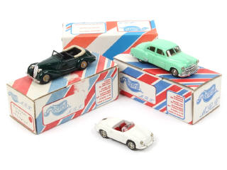 miniatures reproduisant les modèles : PORSCHE (sans essuie-glace), HOTCHKISS (manques de peinture sur le plancher) & CHEVROLET (2 pneus coupés)