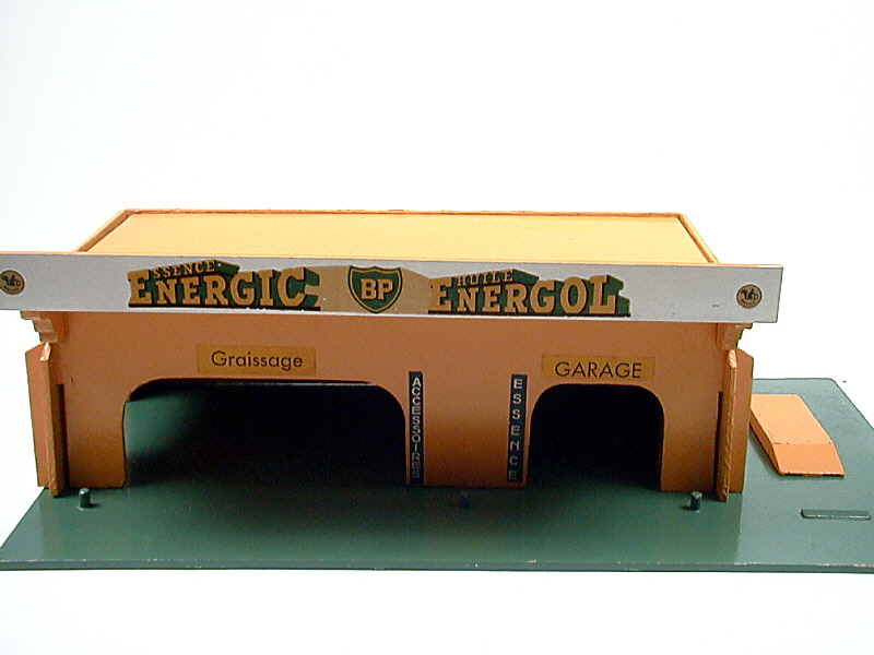 dimensions : 53 x 28 x 17,5 cm - en isorel - manque vraisemblablement un élément sur le côté latéral droit - sans pompe à essence - provient d'un fond de magasin - 53 x 28 x 17.5 cm - plywood - apparently missing one element from the right-hand side panel - original shop stock