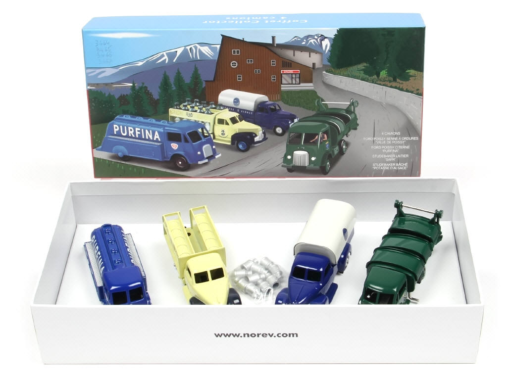 copies des modèles DINKY TOYS - comprend : FORD citerne 'PURFINA', FORD benne à ordures 'VILLE DE POISSY', STUDEBAKER laitier 'SAFR' & STUBAKER bâché 'POTASSE D'ALSACE' - avec sachet de 10 bidons à lait & certificat d'édition limité numéroté 512/1000 exemplaires - petites annotations au crayon sur le couvercle