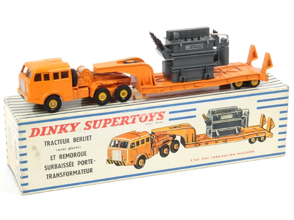 DINKY TOYS (FRANCE) 898 BERLIET Semi-remorque plateau porte-transformateur (version avec jantes de remorque convexes) orange