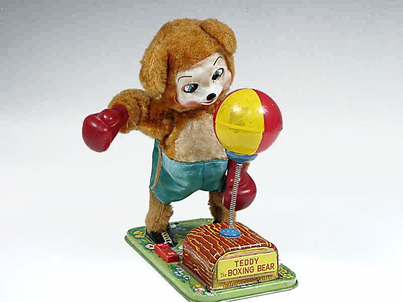 référence 33A du livre de BRIAN MORAN 'BATTERY TOYS' - hauteur 24 cm - en action, l'ours tape dans le punching ball avec ses poings - il bascule son torse d'avant en arrière & sa tête de droite à gauche - les mécanismes fonctionnent - ballon restauré - 24 cm high - in action, the bear punches the punching ball - he rocks his body forward and back and his head from side-to-side - in working condition - ball restored