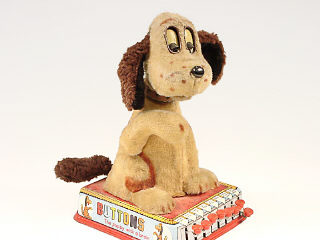 référence 1A du livre de BRIAN MORAN 'BATTERY TOYS' - hauteur 31 cm - des poussoirs permettent de faire bouger la patte, la bouche, les oreilles, les yeux, la tête & la queue de l'animal - tous ces mécanismes manuels fonctionnent - le système à piles est à revoir - 31 cm high - a series of levers allow you to move a paw, the mouth, the ears, the eyes, the head & the tail of the dog - all manual levers in working condition - battery mechanism subject to verification
