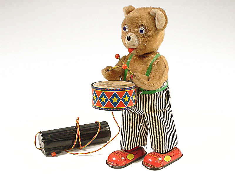 référence 10A du livre de BRIAN MORAN 'BATTERY TOYS' - hauteur 27 cm - en action, l'ours avance en jouant du tambour tandis que ses yeux s'allument & sa tête bouge - mécanismes fonctionnent - in action, the bear moves forwards playing the drum, his eyes light up & his head moves - in working condition