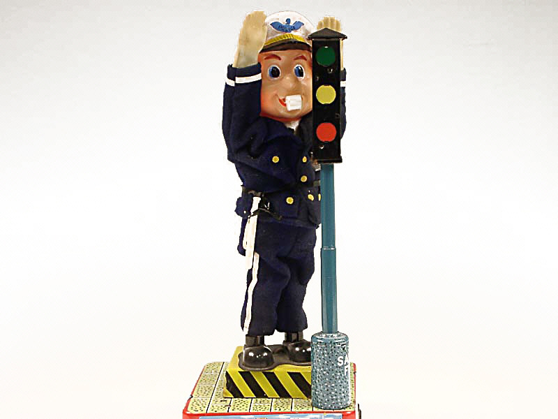 référence 40B du livre de BRIAN MORAN 'BATTERY TOYS' - hauteur 34 cm - en action, le policeman siffle, bouge les bras & tourne sur lui-même tandis que le feu passe du vert au rouge - mécanismes fonctionnent - in action, the policeman whistles, moves his arms & turns in a circle as the light changes from green to red - in working condition