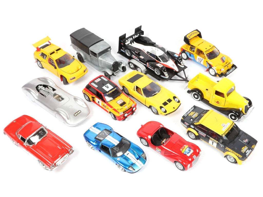 échelle 1/18e - on y retrouve notamment les marques : KYOSHO, MATTEL, JADA, ERTL, SOLIDO & NOREV - comprend notamment les modèles : FORD, FIAT, FERRARI & LAMBORGHINI - un véhicule avec sa remorque - possibilité de manques & parties cassées