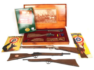 jouets pour enfants - non testés - comprend : carabine, fusil, pistolet à flèches - avec possibilité de petits manques, parties cassées, séchés & oxydées - on retrouve notamment les marques : EDISON GIOCATTOLI (coffret en état 'b') & EUREKA - supports cartonnés en état 'c'