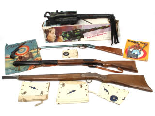 jouets pour enfants - non testés - comprend : carabine, fusil, pistolet à flèches - avec possibilité de petits manques, parties cassées, séchés & oxydées - on retrouve notamment les marques : L'ADHERENT & EUREKA - supports cartonnés en état 'c'