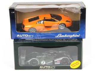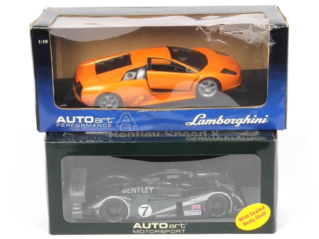 échelle 1/18ème - comprend : BENTLEY SPEED 8 Le Mans 2003 & LAMBORGHINI MURCIELAGO - modèles désolidarisés de leur socle - boites plus ou moins encrassées dont une avec blister déchiré
