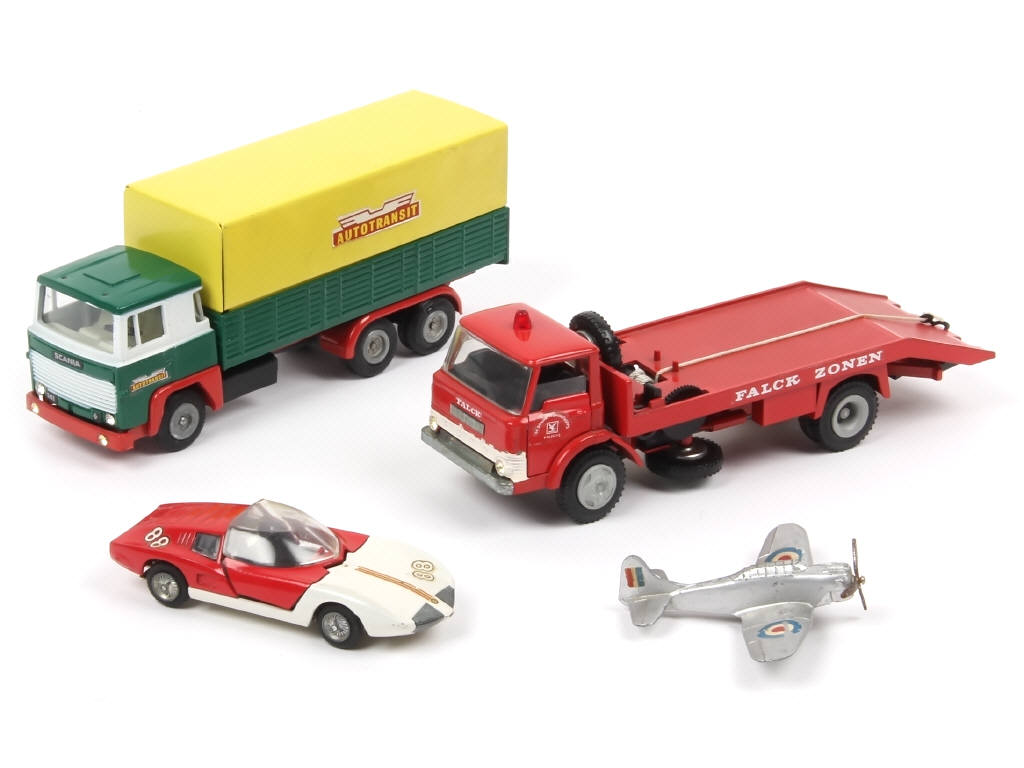 comprend : FORD D800 'FALCK ZONEN', SCANIA 'AUTOTRANSIT' (TEKNO HOLLANDE - manque pannonceau de toit), MONZA GT & DSB-1 (petits manques sur les décalques) - quelques petites traces d'oxydation