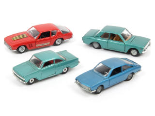 miniatures reproduisant les modèles : JENSEN (autocollants tachés, un manquant), FORD TAUNUS 20M (sans autocollant de plaque minéralogique arrière), ISUZU & OPEL KADETT (version en fibre-glass, état 'A-' un petit éclat sur le toit) - petites traces d'humidité sur certain planchers