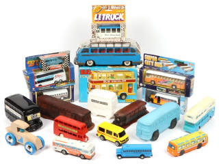 différentes échelles & fabrications - bus électrique FRANCE JOUET non testé avec déformations & traces d'oxydation - comprend des réalisations en cuir - on y retrouve notamment les marques : HOBBY DAX, OBERTOYS, POLFYTOYS & VILAC - 7 modèles en boîte en états 'b' à 'c' - possibilité de manques & parties cassées