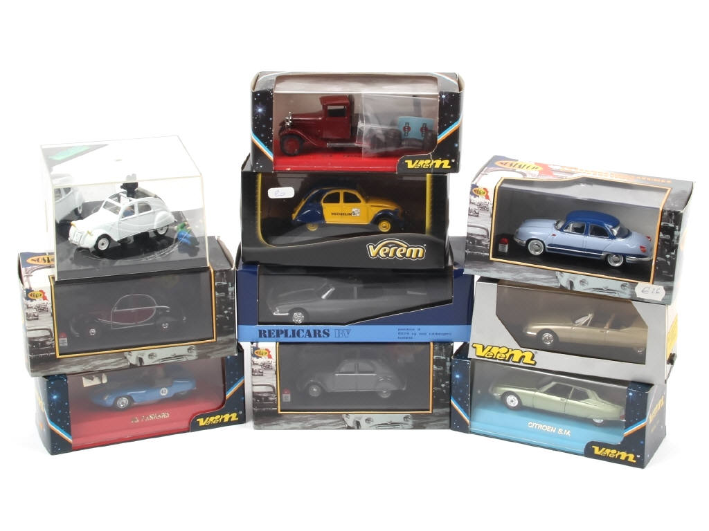 miniatures reproduisant les modèles : CITROËN (principalement) & PANHARD - on y retrouve les marques : VEREM, NOSTALGIE, SOLIDO (boîte non conforme), REPLICARS & VITESSE - quelques accrocs sur les suremballages