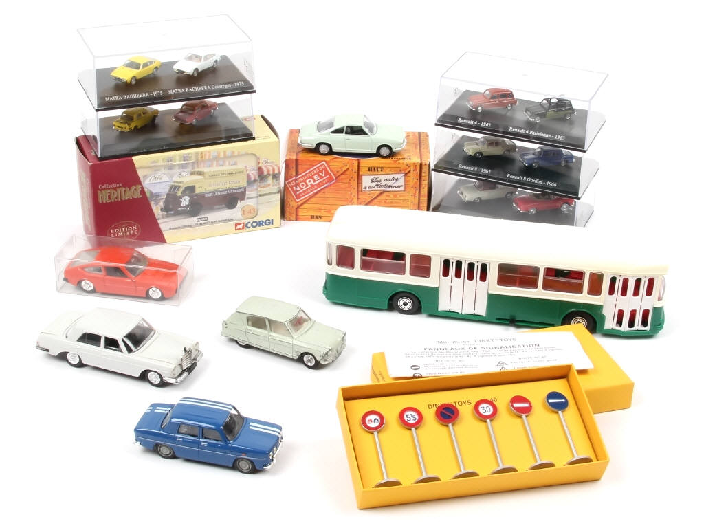 on y retrouve notamment les marques : CORGI TOYS (avec sachet d'accessoires & certificat), SOLIDO (état 'E') & NOREV - les boîtes présentées sont en états 'a' & 'b' - coffret de panneaux de la marque EDITIONS ATLAS