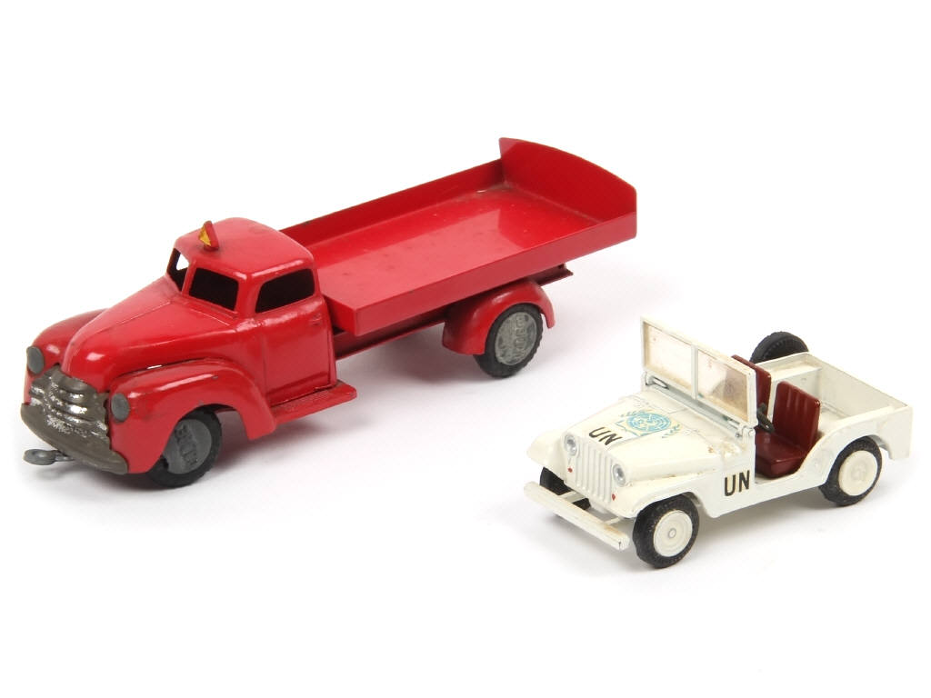 comprend : DODGE plateau (sans chargement, parties chromées ternies, un petit manque de matière sur une jante) & JEEP 'UN' (sans conducteur) - ensemble plus ou moins encrassé