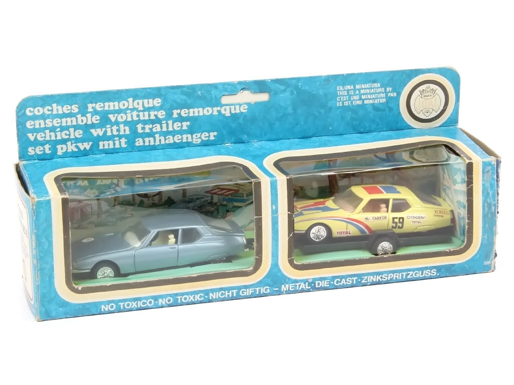 contient : 2 CITROËN CX avec remorque (dont une avec suspensions plus ou moins affaissées & petits manques sur certains décalques) - un rabat de boîte non d'origine