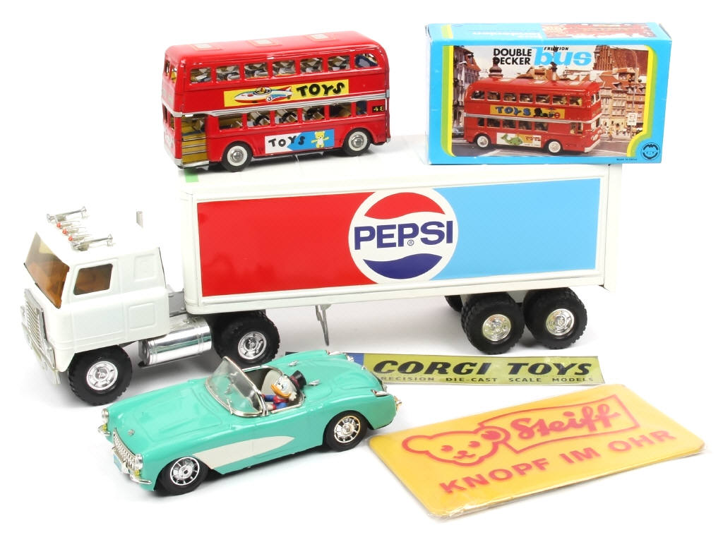 grandes échelles - on y retrouve notamment la marque ERTL - un exemplaire en boîte (état 'b') & un autre avec une figurine non d'origine - on y joint une petite pancarte 'STEIFF' & un autocollant 'CORGI TOYS' (non d'origine)