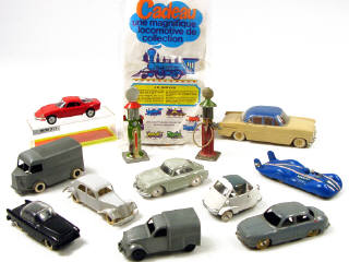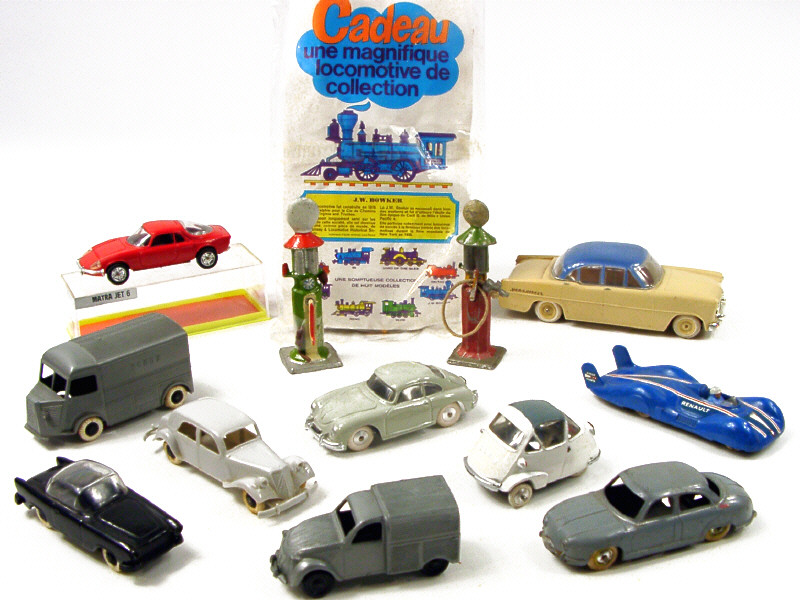 maquette à monter - cadeau publicitaire du groupe NESTLE - sous sachet plastique jamais ouvert - on y joint 2 pompes à essence en fonte d'aluminium de marque inconnue (avec un petit manque)