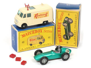 comprend les références : 19 (ASTON MARTIN RACER) & 62 (TV SERVICE VAN - avec antenne & 3 TV) - boites en état 'b' avec accrocs