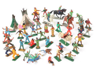 STARLUX (FRANCE) Ensemble de 41 figurines du far-west, 4 chevaux, un bloc tipi & 2 totems