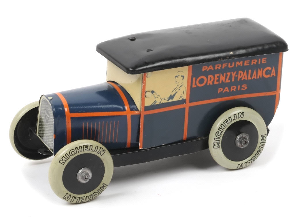 G. de ANDREIS (FRANCE) PEUGEOT 201 Fourgonnette 'PARFUMERIE LORENZY-PALANCA-PARIS' en tôle lithographiée bleu, noir filets orange
