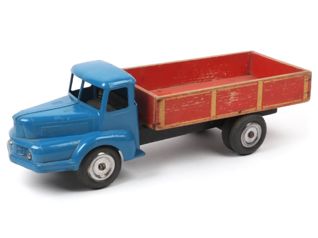 jouet à traîner en plastique & bois - longueur : 44 cm - manques de peinture plus ou moins importants par endroits sur le plateau (très légers manques de matière) - petites traces d'oxydation sur les jantes - frottements sur la cabine