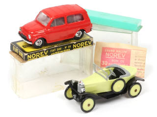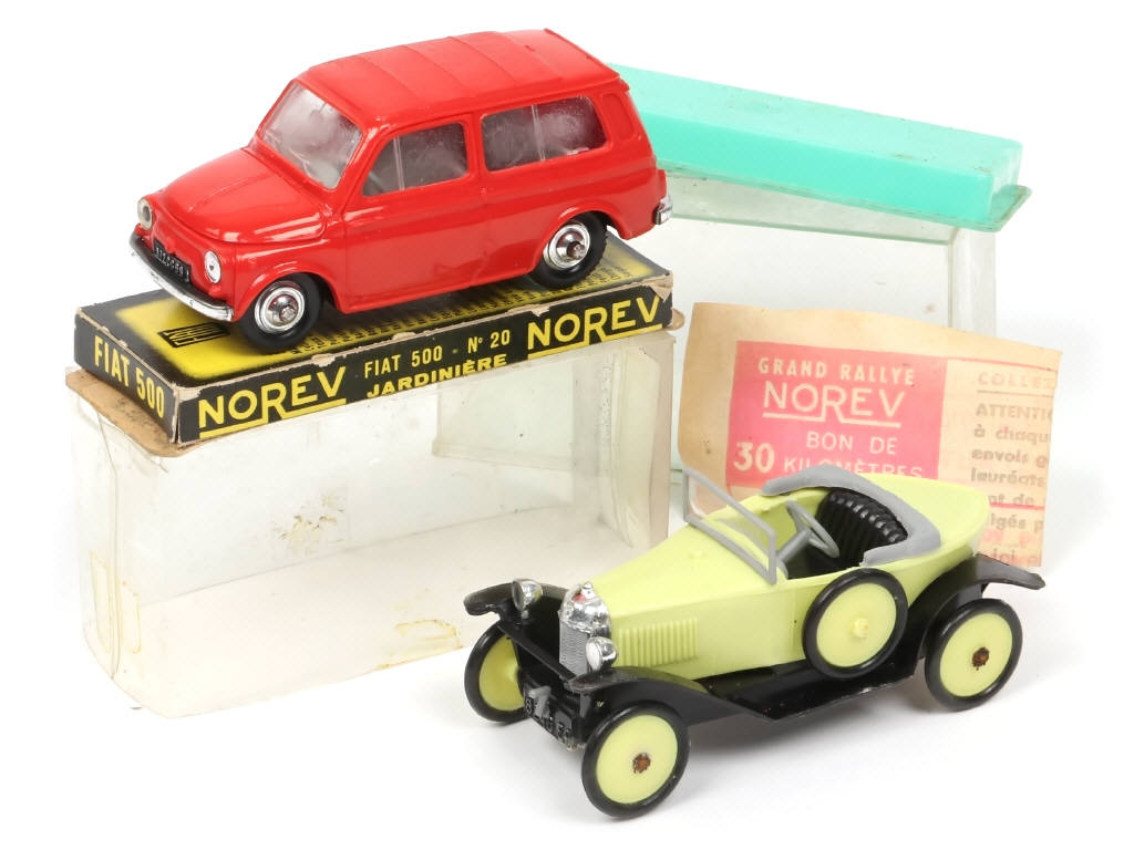 comprend les modèles : FIAT 500 JARDINIERE & CITROËN 5HP - avec bulletin d'inscription au 'GRAND RALLYE NOREV' 1959 - très légère déformation des carrosseries - boîtes légèrement encrassées