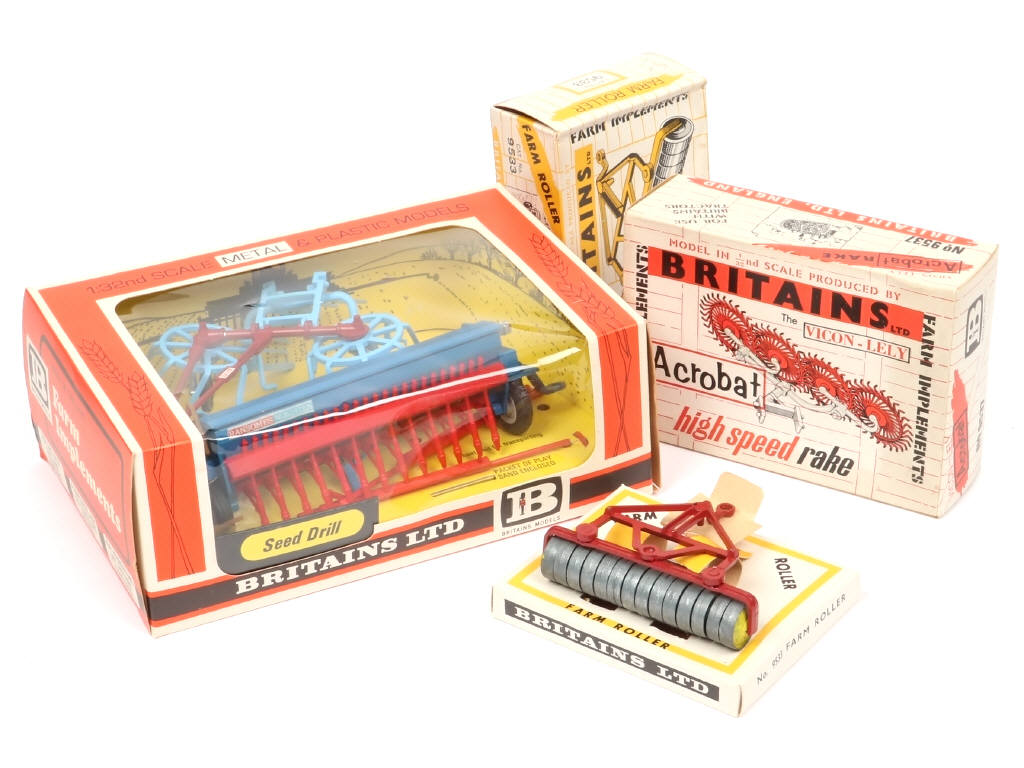 comprend les références : 9533, 9537 (manque une tige de roue) & 9539 - on y joint un râteau à foin rotatif de la marque (sans boîte) - quelques accrocs, petites déchirures & très légers manques de carton plus ou moins importants sur les boîtes