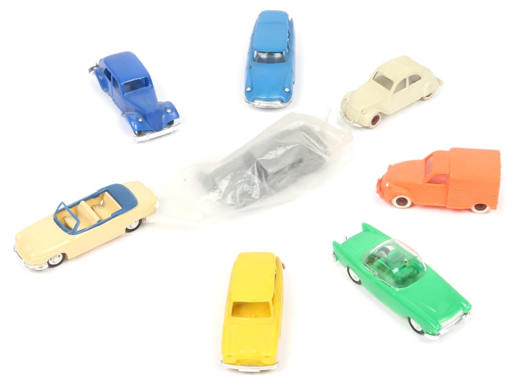 miniatures reproduisant les modèles : SIMCA, CITROËN (un exemplaire avec une extrémité de plancher décollée), PANHARD & RENAULT (sous sachet d'origine jamais ouvert 'BONUX') - carrosserie plus ou moins encrassées