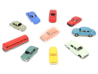 miniatures reproduisant les modèles : SIMCA, CHAUSSON, PANHARD, CITROËN, PEUGEOT & RENAULT (un exemplaire sous sachet plastique jamais ouvert) - on y retrouve notamment les marques : SESAME (traces d'oxydation sur les planchers), CLE & MINIALUXE - quelques manques & parties cassées sur l'autocar