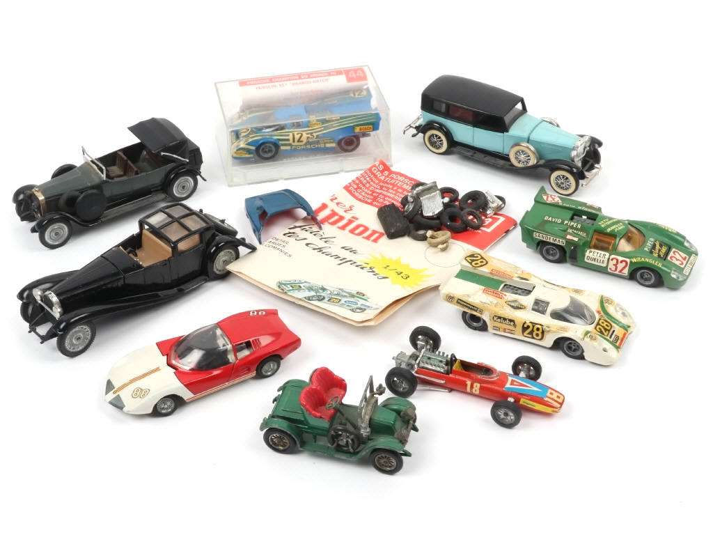 on y retrouve les marques : SOLIDO, TEKNO, MATCHBOX & CHAMPION - un véhicule en boite (état 'b') - avec dépliant & quelques accessoires - manques & parties cassées