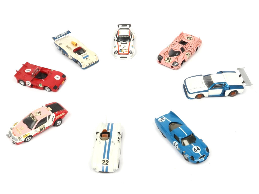 kits montés - miniatures reproduisant notamment les modèles : PORSCHE, ALFA ROMEO & ALPINE - on y retrouve notamment les marques : M.R.E & AMR - quelques petits éléments décollés & manquants