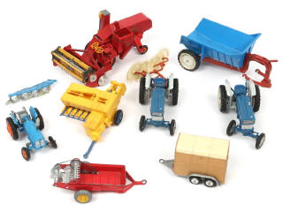 on y retrouve les marques : BRITAINS (2 jantes fondues sur un exemplaire), DINKY TOYS & CORGI TOYS - avec manques & parties cassées - ensemble plus ou moins encrassé
