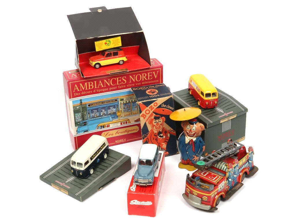 on y retrouve notamment les marques : NOREV (pneus incomplets sur le CHENARD & WALKER), SOMERVILLE MODELS (une extrémité de pare-choc cassée & manquante) & JOUSTRA - 2 exemplaires avec moteurs (fonctionnent) - parties chromées ternies sur le camion de pompiers - les boîtes sont en états de 'b' à 'e' (un exemplaire sans boîte) - avec manques, parties cassées & légèrement oxydées (plus ou moins importants suivant les modèles)