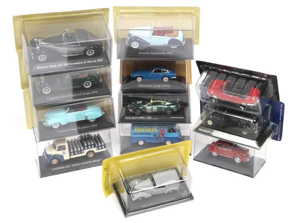 modèles vendus en kiosque - miniatures reproduisant notamment les modèles : PEUGEOT, PANHARD & CITROËN (un rétroviseur à refixer)
