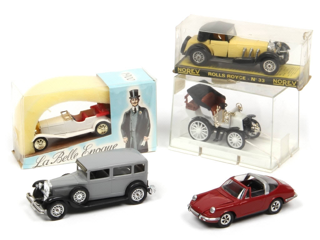 comprend les modèles : PORSCHE (avec petits détails ajoutés), FIAT, ROLLS ROYCE & MERCEDES - on y retrouve les marques : CLE, NOREV, MINIALUXE & SAFIR - ruban adhésif sur les boites