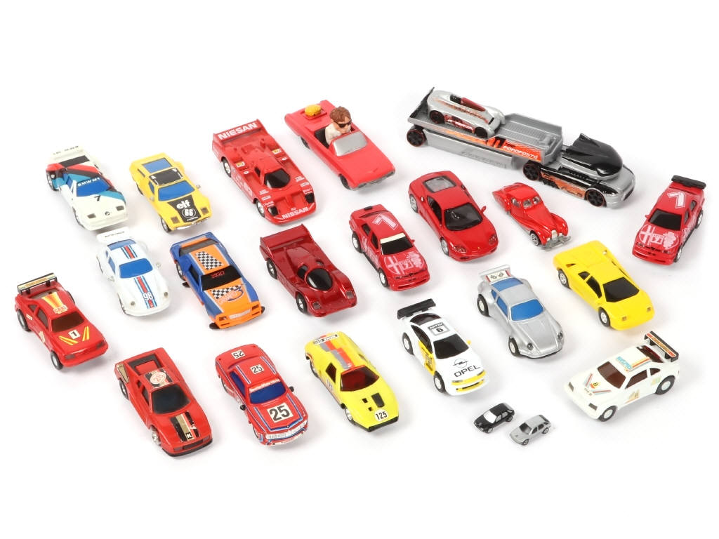 14 slotcars (non testés), un modèle à rétro-friction (testé, fonctionne) - on y retrouve notamment les marques : MATTEL & DISNEY - manques & parties cassées
