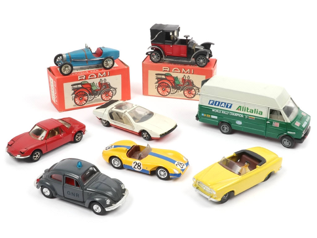 on y retrouve les marques : JMK RAMI (parties repeintes & détails de peinture ajoutés - 2 boites en état 'b'), VEREM (PEUGEOT 403 cabriolet), SOLIDO (FERRARI moderne), TOMICA (VW 1200 'GNR'), MÄRKLIN (MATRA 530), SABLON (LAMBORGHINI MARZAL - jantes fondues) & OLD CARS (FIAT 'ALITALIA' - une roue mal fixée)