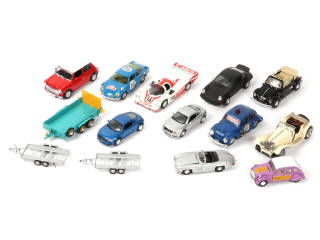 un modèle à clé (moteur à revoir) - différentes échelles, un modèle en état 'R' - on y retrouve notamment les marques : WELLY, GUISVAL, POLISTIL, BRITAINS, MARTOYS & NEWRAY - comprend les modèles : MINI, ALPINE, PORSCHE, VOLKSWAGEN, AUDI, CITROËN, MERCEDES & JAGUAR - on y joint 3 remorques - manques & parties cassées