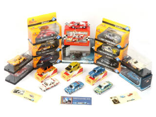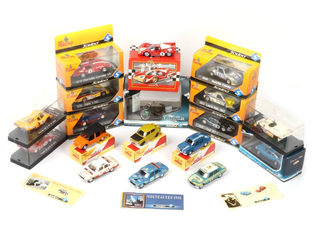 comprend les modèles : PORSCHE, CHEVROLET, FERRARI, CITROËN, RENAULT, PEUGEOT, FORD, LANCIA, ALPINE & SOLEX - on y joint 3 catalogues de 1997, 1998 & 1999 - 3 modèles sans boîte en état 'B' (décalques fatigués & couleurs passées) - possibilité de manques & parties cassées