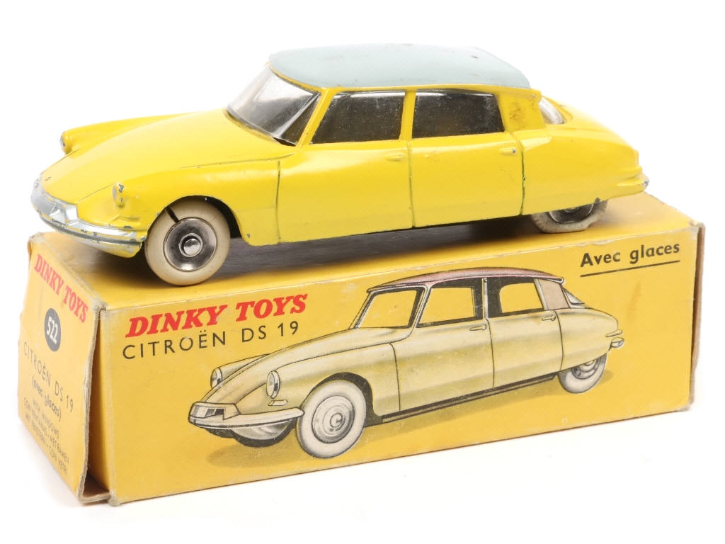 DINKY TOYS (FRANCE) 522 CITROËN DS 19 (version avec vitres & jantes concaves) jaune citron, toit gris clair
