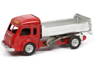longueur 16 cm - moteur à clef (fonctionne) - avec décalque 'RENAULT' sur le haut de la cabine - pare-chocs avant légèrement déformé - traces d'oxydation sur la benne par endroits (principalement à l'intérieur de celle-ci) - manivelle, roue dentée & axe de basculement de benne ternis