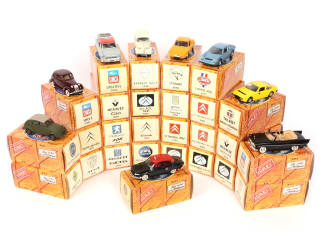comprend les modèles : CITROËN, SIMCA, LIGIER, MATRA, MEGA, PEUGEOT, TALBOT, PANHARD & RENAULT - boîtes en états 'b' (traces sur une boîte) - possibilité de manques & parties cassées