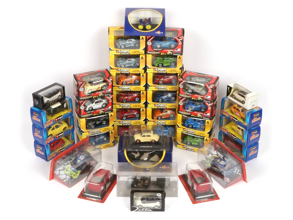 on y retrouve notamment les marques : ALTAYA, BBURAGO, NOREV & KENTOYS - comprend notamment les modèles : NISSAN, LANCIA, VOLKSWAGEN & TOYOTA - boîtes en états 'b' à 'c' - possibilité de manques & parties cassées