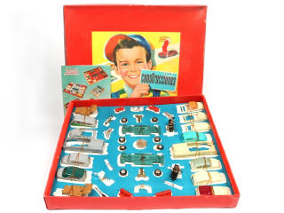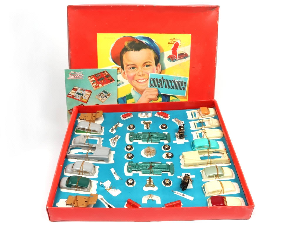 longueur des véhicules 12 cm - complet - dimensions du coffret : 47 x 42 cm - contient différents éléments de carrosseries & accessoires (plus ou moins encrassés, avec petites traces d'oxydation par endroits & jantes craquelées) permettant la réalisation de différents types d'automobiles par assemblage (dépliant présent) - ensemble maintenu sur carton de présentation - boîte légèrement déformée & encrassée (un manque de papier sur l'illustration)