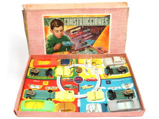échelle 1/32ème - dimensions : 51,5 x 35 cm - contient carrosseries de : STUDEBAKER LARK (2 exemplaires dont un coupé & un cabriolet), CITROEN DS 19, PORSCHE 356 A, 4 châssis avec moteurs à friction (non testés), 4 aménagements intérieurs, vitrages, pare-chocs & boîte de visseries (manque tournevis) - ensemble maintenu d'origine sur carton de présentation illustré avec dénomination de chaque véhicule & sa référence - ensemble plus ou moins encrassé (coffret plus ou moins taché, décoloré & déchiré)